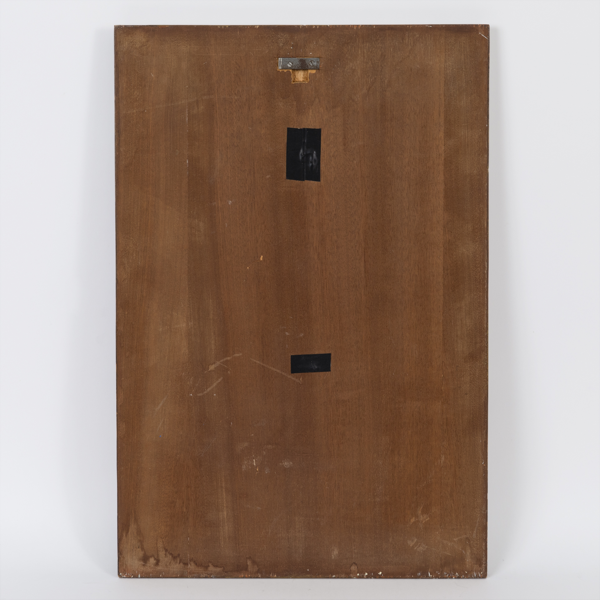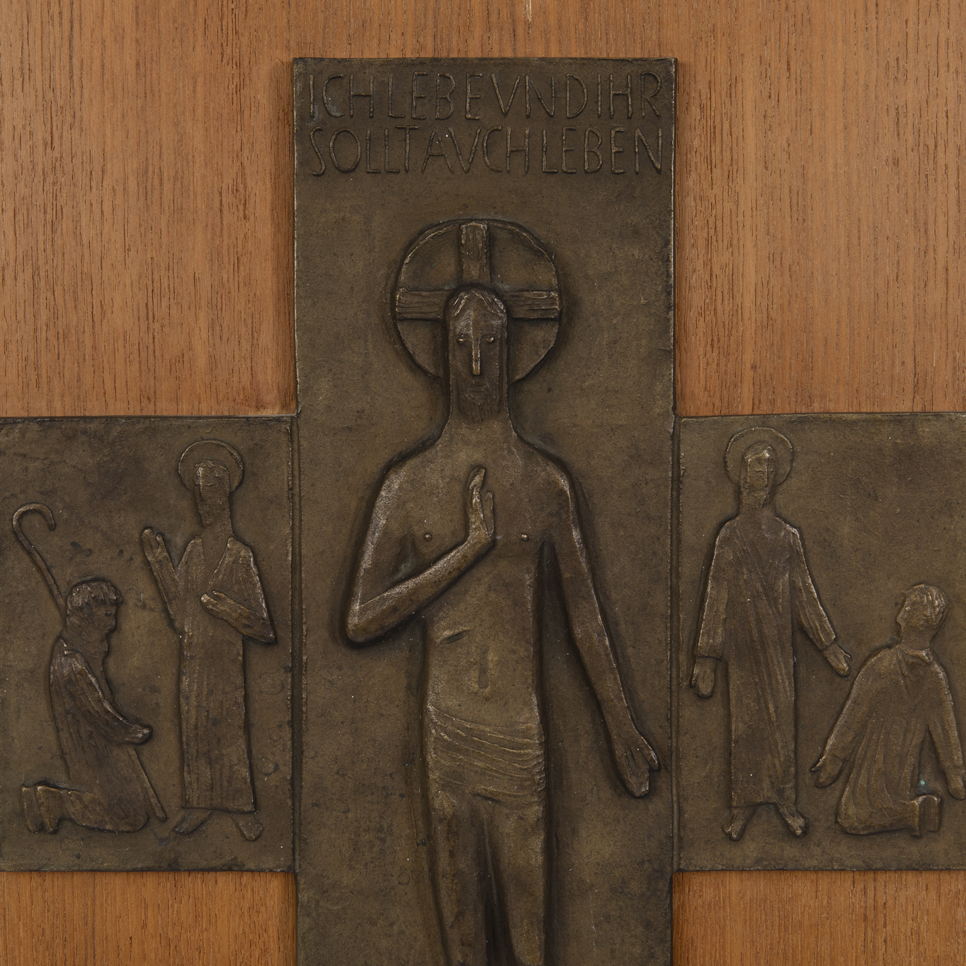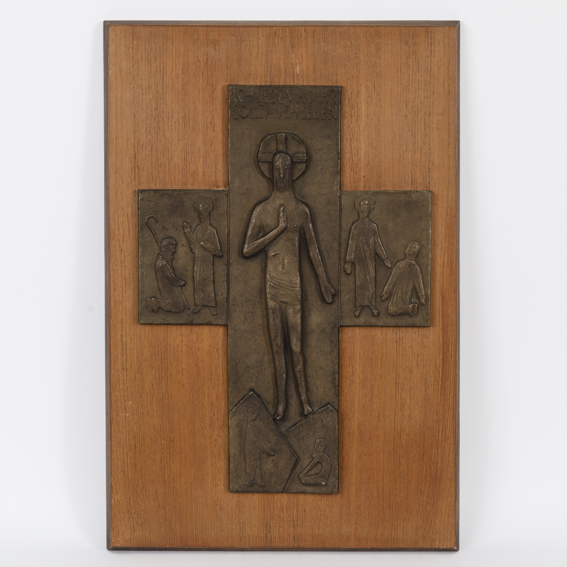 Bronze, braun patiniert, auf rechteckiger Holzplatte; Kruzifix, wie ein Triptychon aufgeteilt, mit halbplastischer Darstellung von Jesus unter der Inschrift „Ich lebe ihr sollt auch leben“ und darunter einer Darstellung vermutlich seiner Auferstehung in der Mitte sowie links und rechts zwei Szenen aus dem Leben Jesu Christi; rückseitig Einkerbung zur Aufhängung sowie zwei Löcher mit Drahtseilen, die die Bronze an der Holzplatte befestigen, unter losen Klebestreifen; die Verbindung zwischen Relief und Holzplatte ist leicht gelockert; einige Wasserflecken und Abplatzungen an der Holzplatte; altersbedingte Gebrauchsspuren; Maße Bronzerelief: ca. 43,7 x 31,3 cm; Maße Holzplatte: ca. 57,5 x 38,5 cm; Gesamtgewicht: ca. 5,12 kg. Versand ausschließlich durch Spedition oder auf Risiko des Käufers.