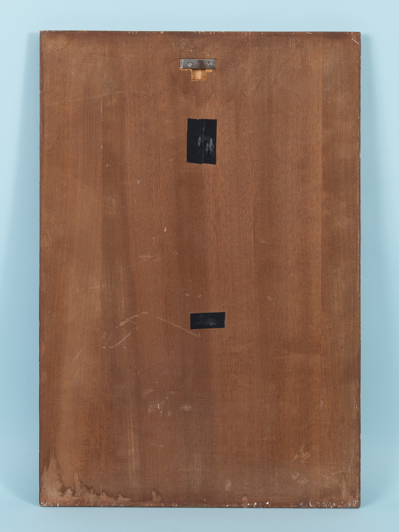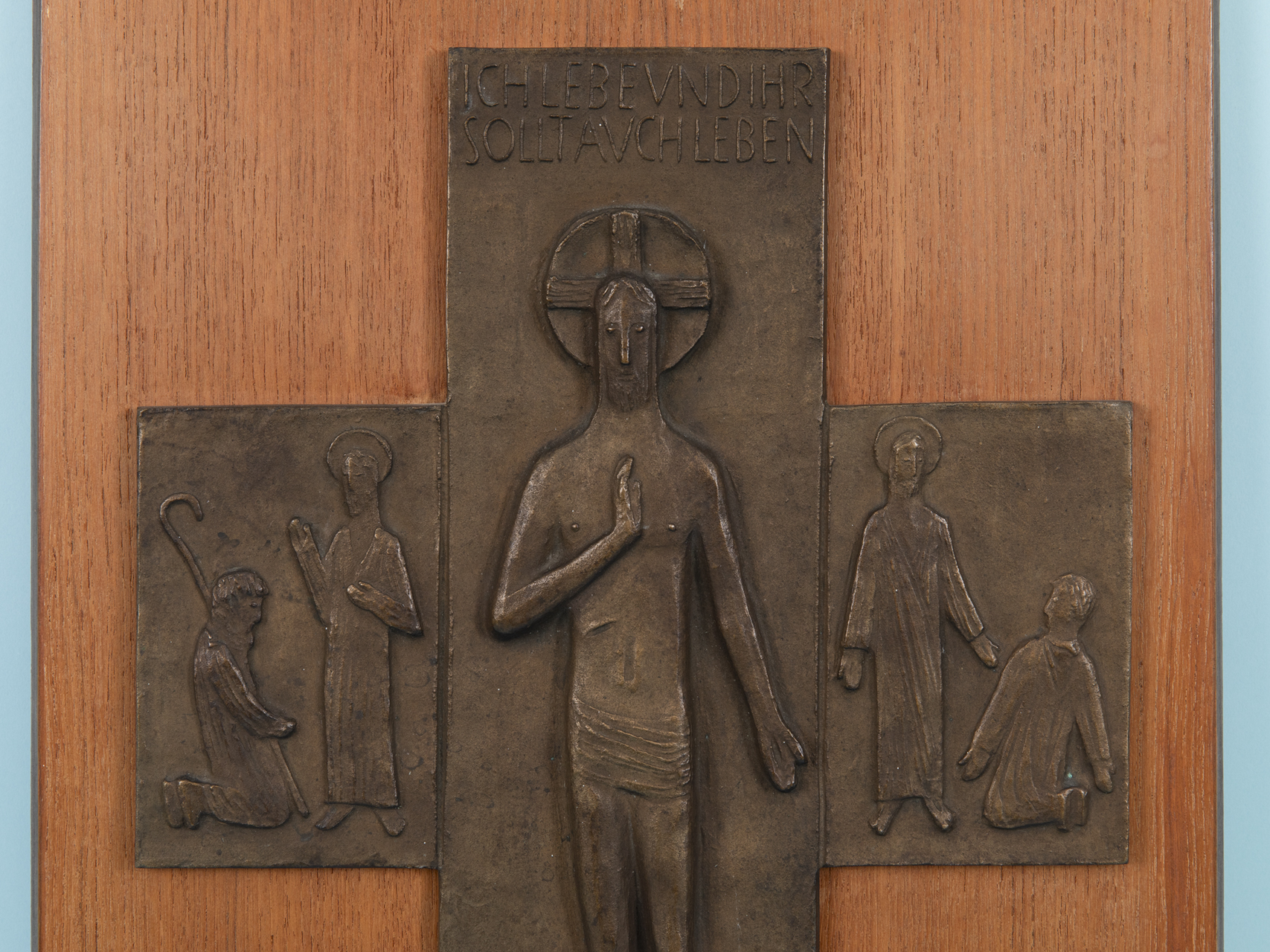 Bronze, braun patiniert, auf rechteckiger Holzplatte; Kruzifix, wie ein Triptychon aufgeteilt, mit halbplastischer Darstellung von Jesus unter der Inschrift „Ich lebe ihr sollt auch leben“ und darunter einer Darstellung vermutlich seiner Auferstehung in der Mitte sowie links und rechts zwei Szenen aus dem Leben Jesu Christi; rückseitig Einkerbung zur Aufhängung sowie zwei Löcher mit Drahtseilen, die die Bronze an der Holzplatte befestigen, unter losen Klebestreifen; die Verbindung zwischen Relief und Holzplatte ist leicht gelockert; einige Wasserflecken und Abplatzungen an der Holzplatte; altersbedingte Gebrauchsspuren; Maße Bronzerelief: ca. 43,7 x 31,3 cm; Maße Holzplatte: ca. 57,5 x 38,5 cm; Gesamtgewicht: ca. 5,12 kg.