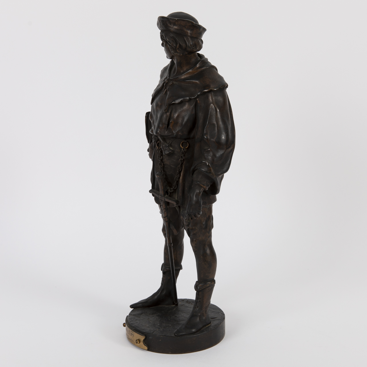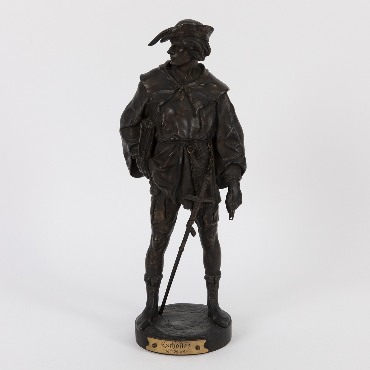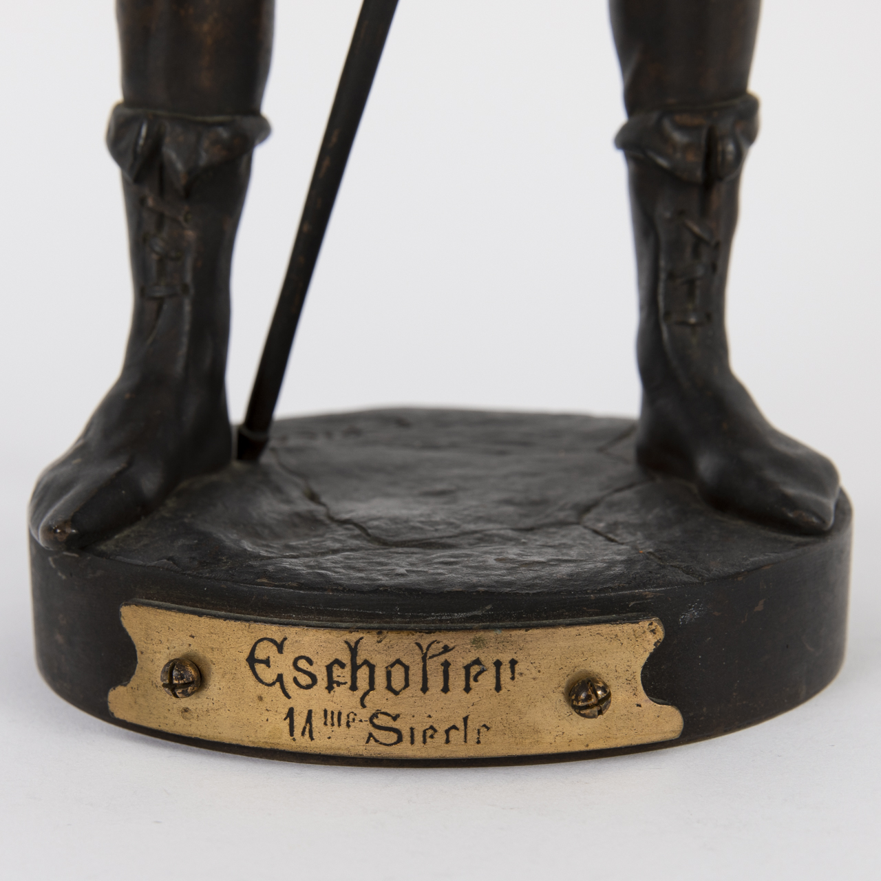 Brown-patinated bronze; “Escholier 14th century”; male figure in a medieval robe and hat with feather, carrying a book under one arm, a sword fastened to the belt, and holding a ring on one finger from which a lamp originally hung, now missing; mounted on a round bronze plinth with stone-slab structure; signed and titled on the plinth; surface irregularly patinated and rubbed; height: approx. 36 cm; weight: approx. 3585 g.