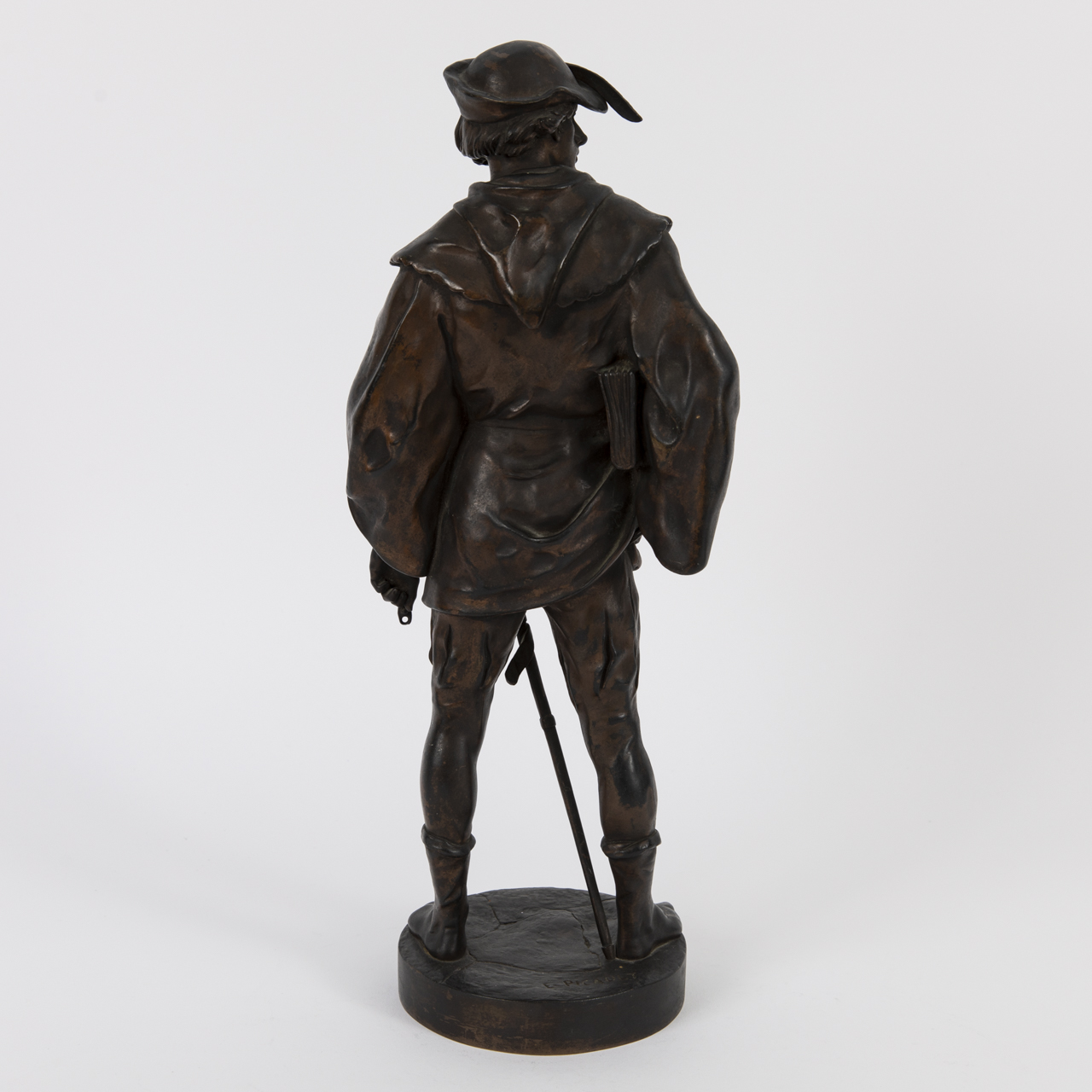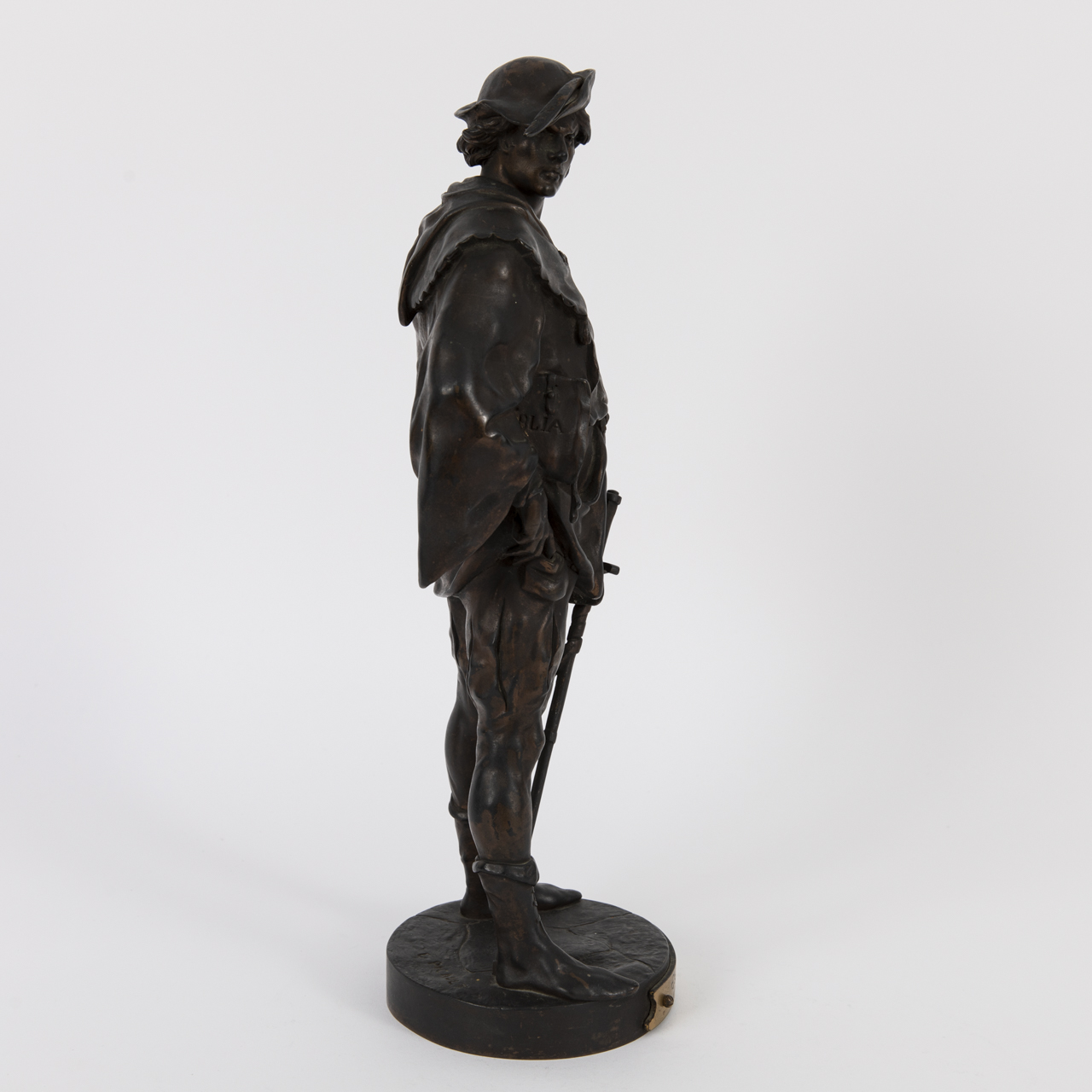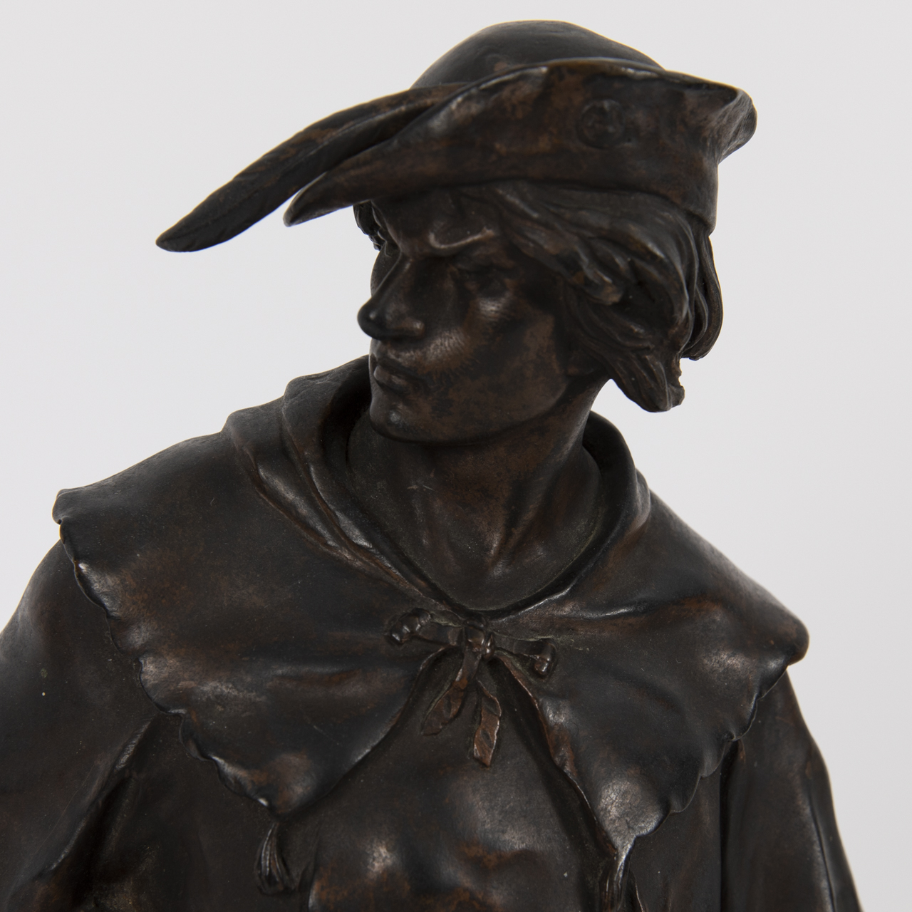 Brown-patinated bronze; “Escholier 14th century”; male figure in a medieval robe and hat with feather, carrying a book under one arm, a sword fastened to the belt, and holding a ring on one finger from which a lamp originally hung, now missing; mounted on a round bronze plinth with stone-slab structure; signed and titled on the plinth; surface irregularly patinated and rubbed; height: approx. 36 cm; weight: approx. 3585 g.