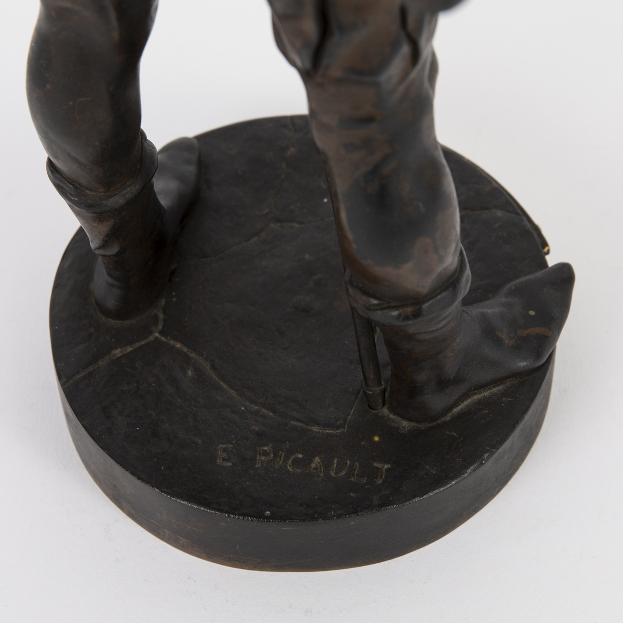 Bronze braun patiniert; „Escholier 14. Jahrhundert“; männliche Figur in mittelalterlicher Robe und Hut mit Feder, unter einem Arm ein Buch tragend, am Gürtel ein Schwert befestigt und an einem Finger einen Ring haltend, an dem ursprünglich eine Lampe befestigt war, die fehlt; auf runder Bronzeplinthe mit Steinplattenstruktur montiert; auf der Plinthe signiert und betitelt; Oberfläche unregelmäßig patiniert bzw. berieben; Höhe: ca. 36 cm; Gewicht: ca. 3585 g.