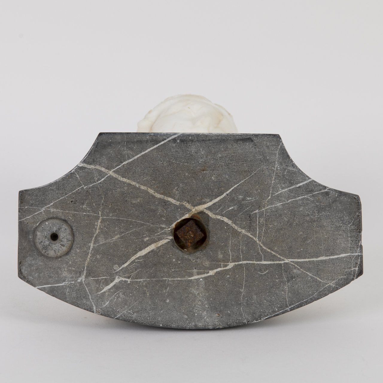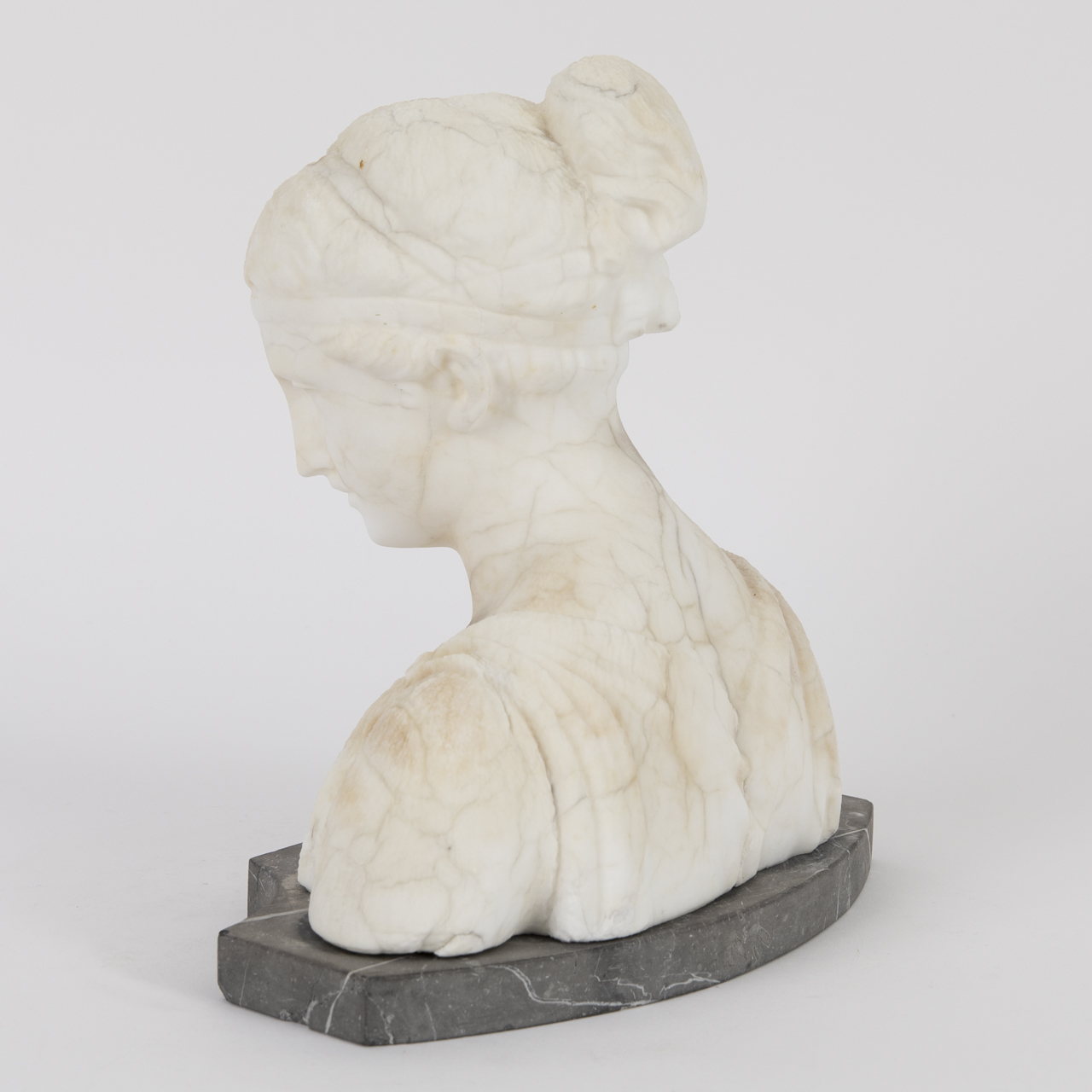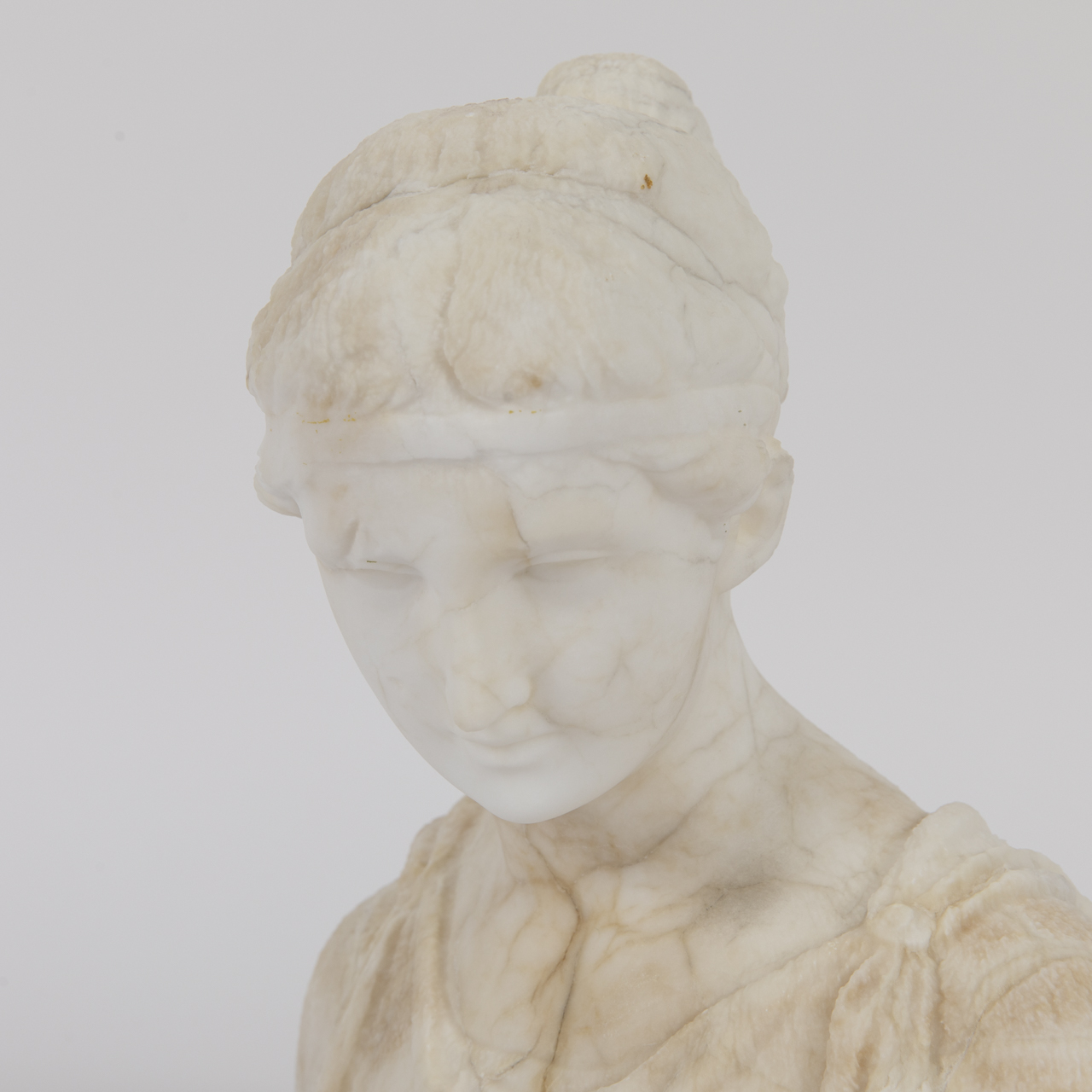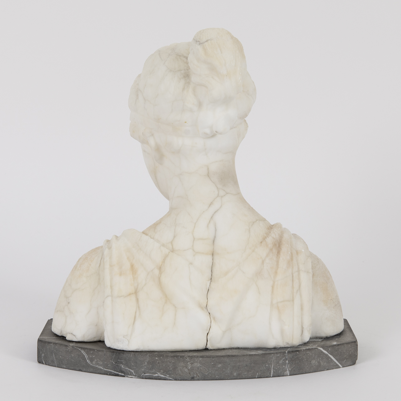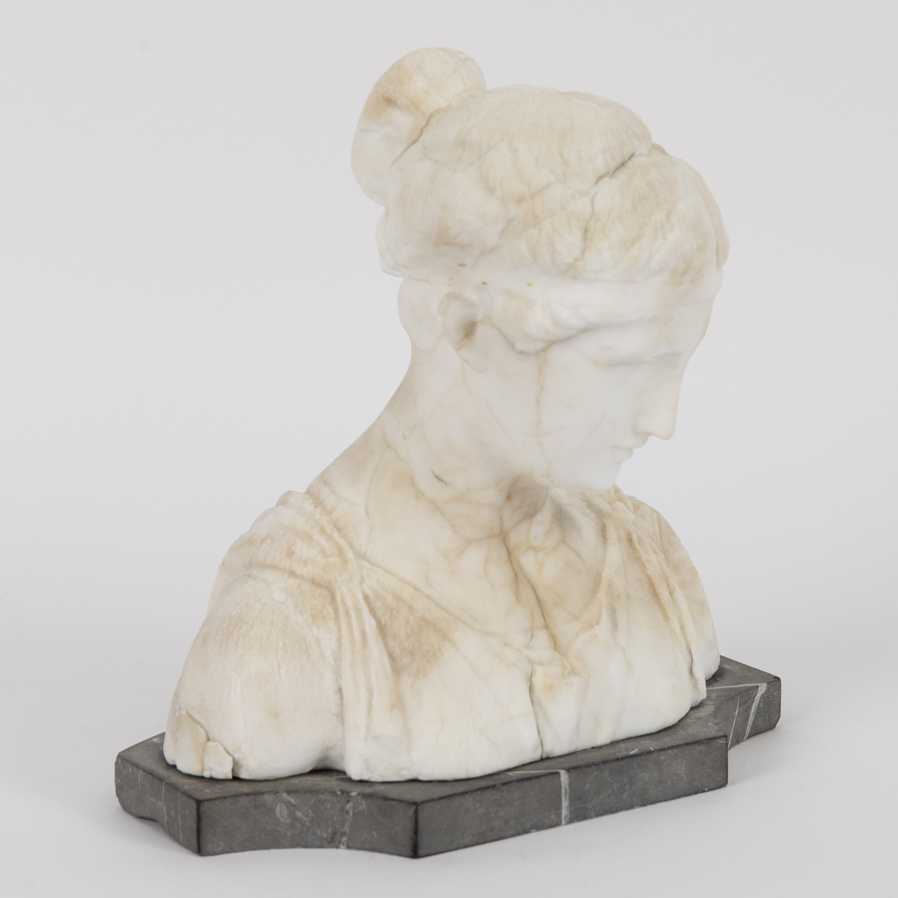 Bust made of white alabaster mounted on a quatrefoil plinth of veined grey marble; bust of the Greek goddess of youth, eternal beauty and vitality, Hebe, with lowered gaze; some cracks and losses as well as strong age-related discolourations; connection between plinth and bust needs adjustment; height: approx. 23 cm; total weight: approx. 4.57 kg.