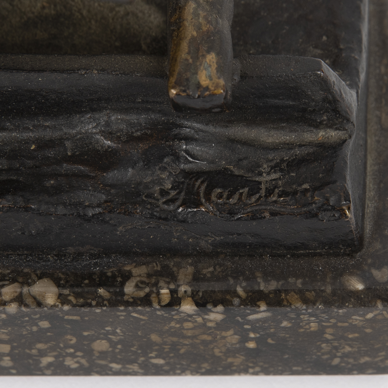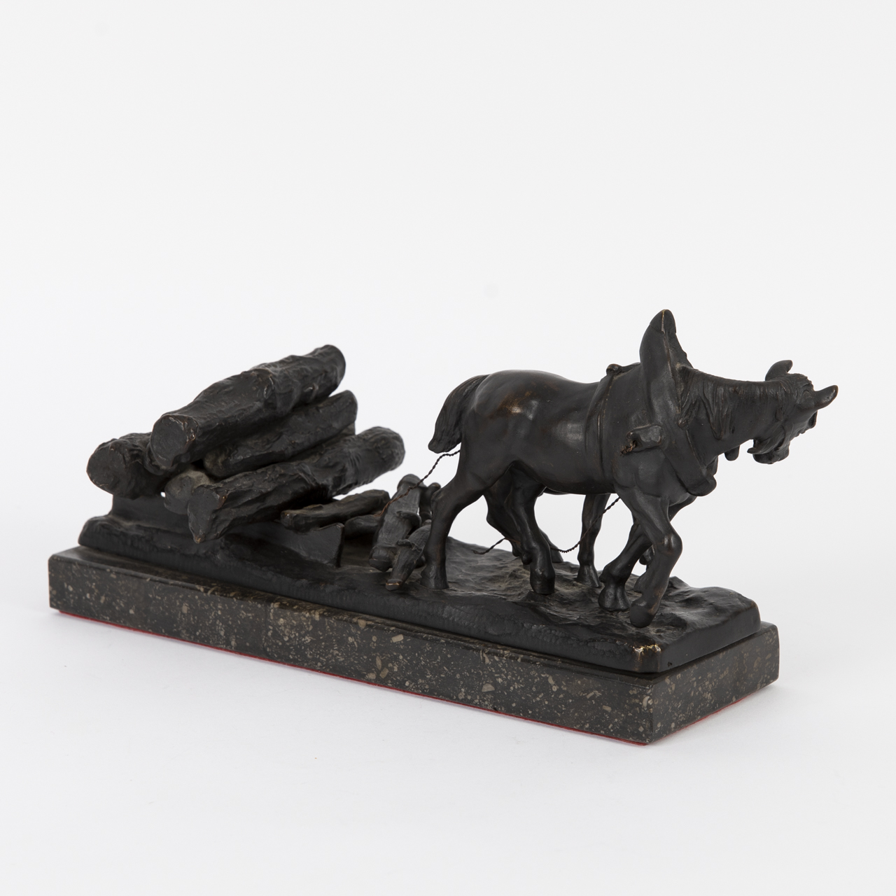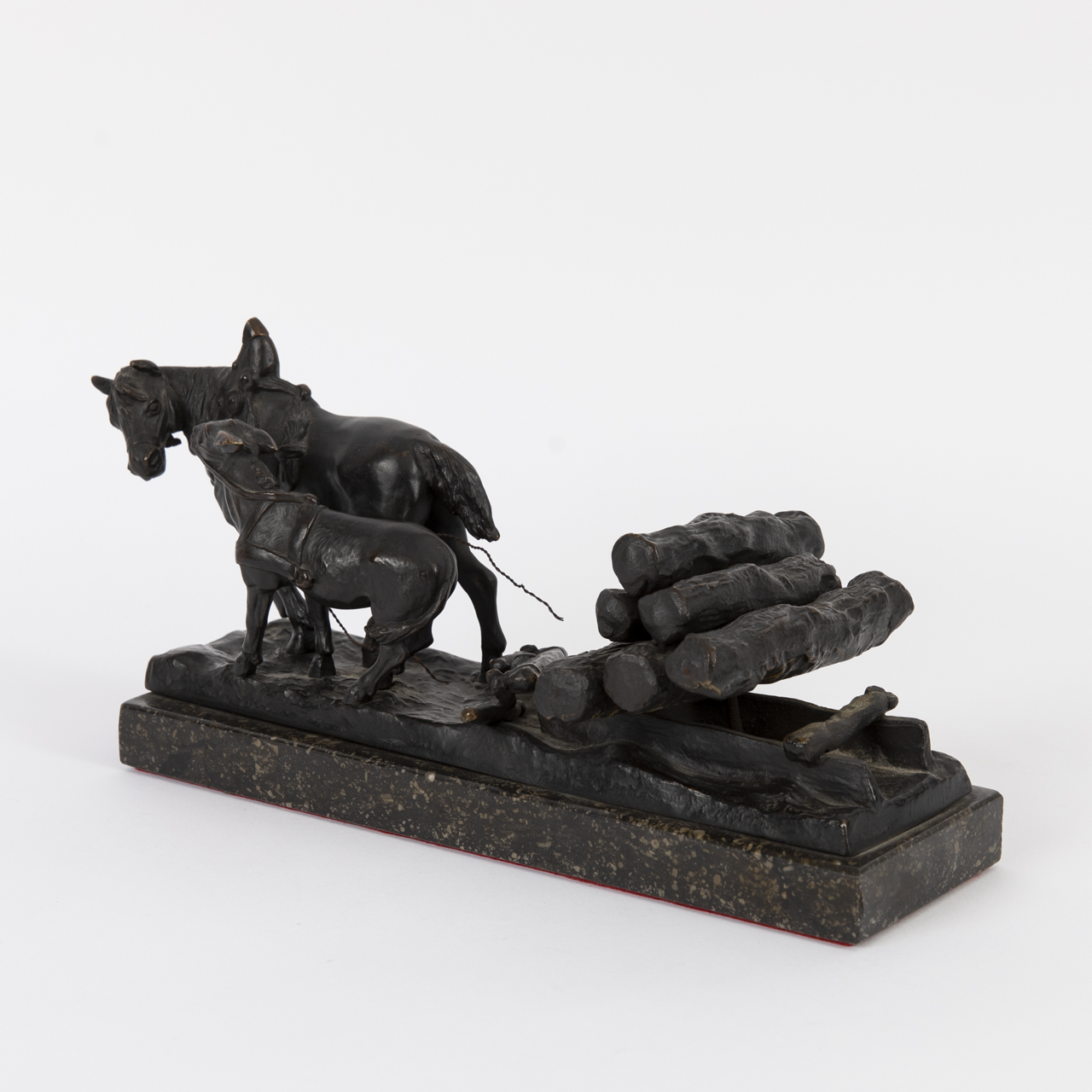 Bronze braun patiniert; Darstellung eines gehalfterten Esels und eines Pferdes, einen Schlittenzug mit Baumstämmen beladen, hinter sich ziehend; auf dunkler, rechteckiger Marmorplinthe montiert; auf der Plinthe signiert „Martin“; mehrere lose Verschraubungen und Verspannungen zum Pflug; Oberfläche leicht berieben; Gesamtmaße: ca. 14,5 x 31,5 x 12,3 cm; Gewicht: ca. 4101 g.