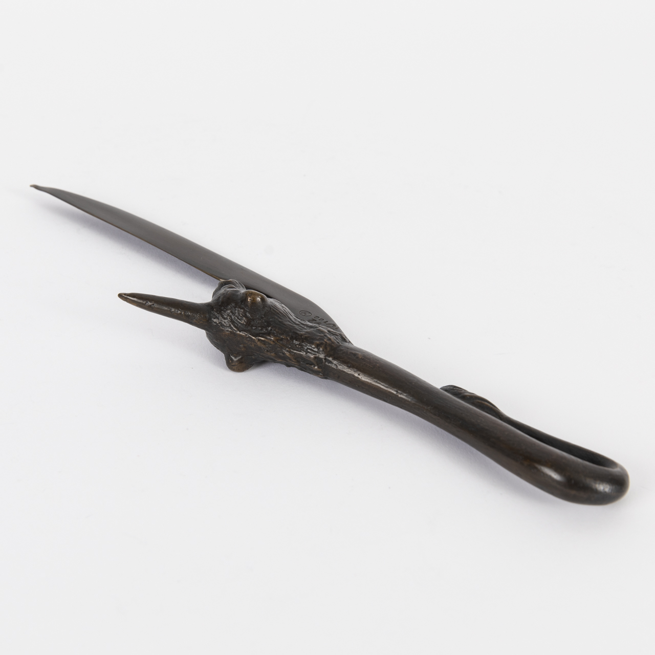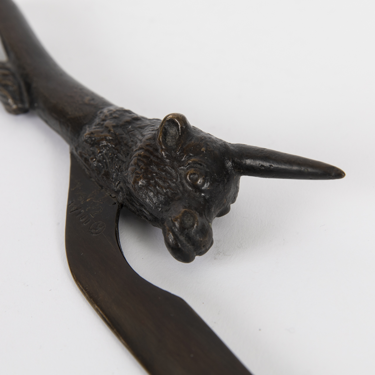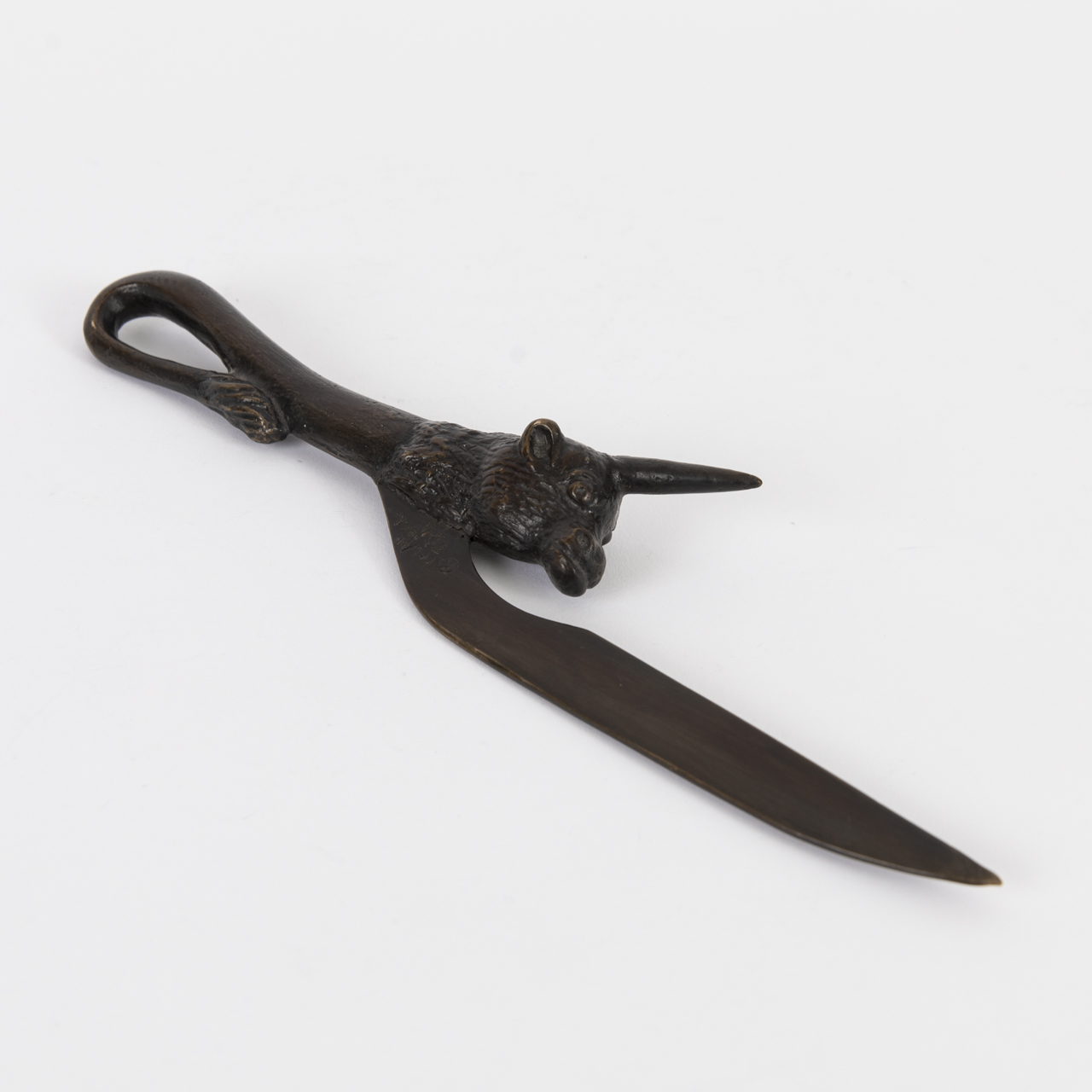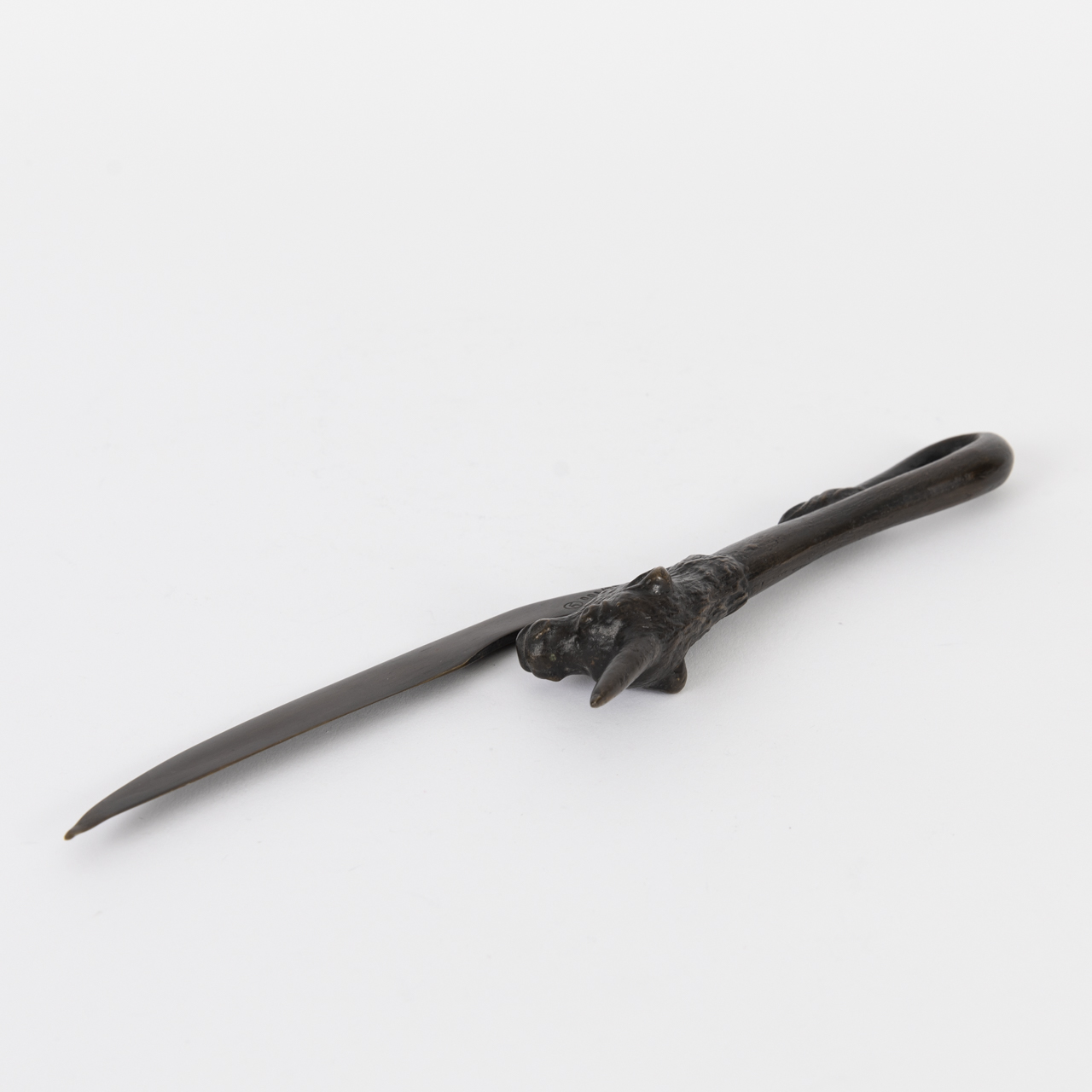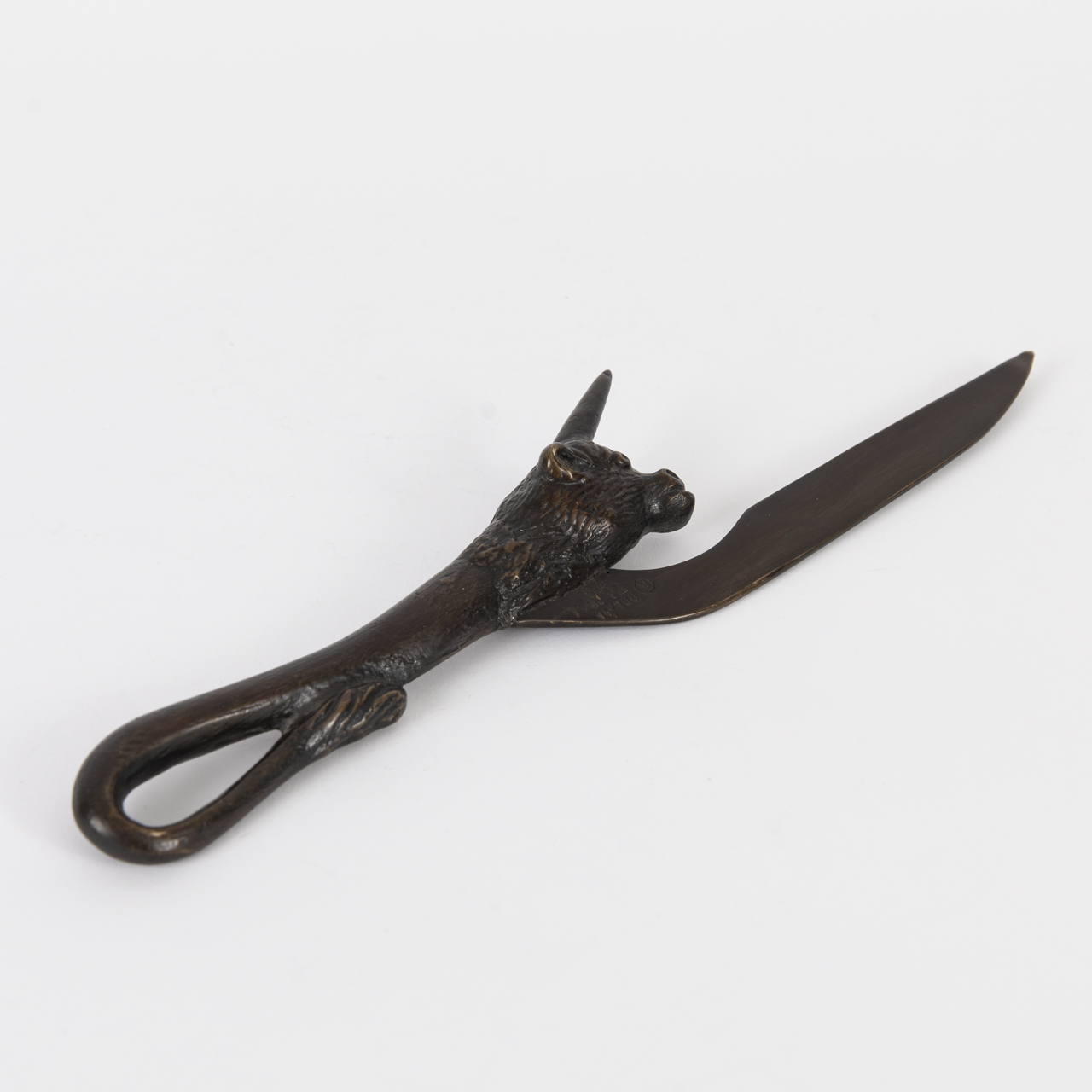 Bronze, brown patinated; “Unicorn” from 1992; figurative letter opener, also called “Yvel object”, with handle in the shape of a unicorn and long spike; inscribed on the spike “Yvel 92”, numbered “14/100” and with artist’s stamp; age-related signs of wear, casting flaw at the joint between handle and spike, tip of the spike slightly bent; length: approx. 26.8 cm.