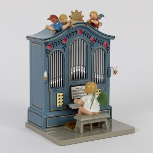 Erzgebirge woodcarving by the region’s most traditional and renowned manufacturer; depiction of an angel at a finely crafted organ (without musical movement); the playing angel and the two crowning angels are removable (plug-in); the two candles are movable; the organ fits the upper level of both the 4-tiered and 6-tiered “Engelberg” arrangement; very good condition with minimal age-related signs of wear; height: approx. 15 cm; weight: approx. 260 g.