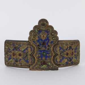 Gilded brass bronze; total weight: approx. 618 g; divided into three segments; densely decorated with relief and applied floral and ornamental motifs; outlined with green and azure-blue enamel; set in places with green and red glass flux stones and metal hemispheres; dimensions: approx. 20.5 x 14 cm; age-related signs of wear.