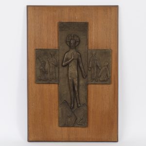 Bronze, brown patinated, mounted on a rectangular wooden plaque; crucifix structured like a triptych, with a semi-sculptural depiction of Jesus beneath the inscription “Ich lebe ihr sollt auch leben” (“I live you also shall live”), and below that a probable depiction of his resurrection in the center, flanked by two scenes from the life of Jesus Christ on the left and right; groove on the reverse for hanging, as well as two holes with wire cables fastening the bronze to the wooden plaque under loose adhesive strips; the connection between relief and wood is slightly loosened; some water stains and chipping on the wooden plaque; age-related signs of wear; dimensions of bronze relief: approx. 43.7 x 31.3 cm; dimensions of wooden plaque: approx. 57.5 x 38.5 cm; total weight: approx. 5.12 kg.