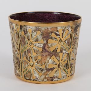 Copper, gilt with polychrome enamel décor; beaker with conical body, copper fillets in floral form with vertical and horizontal segmentations, filled with enamel in white, green and violet tones with a golden shimmer on the front, interior enamelled with craquelure structure in red and violet tones; monogrammed on the underside; surface rubbed, well-maintained condition; height: approx. 7.2 cm; weight: approx. 220 g.