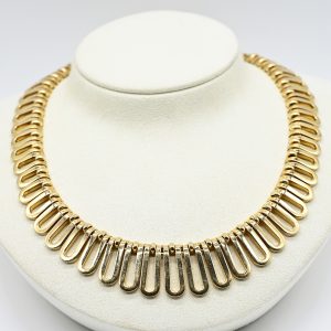 750/- yellow gold; total weight: approx. 85.8 g; individual links in loop and ring décor with lateral progression; concealed box clasp and side safety catch; width at the centre of the necklace: approx. 23.3 mm and at the end approx. 14.4 mm; total length: approx. 40.5 cm; reverse stamped with K.