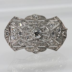 585/- yellow and white gold; total weight: approx. 13.4 g; stylised butterfly shape; central bar set with 15 pavé-set brilliant-cut diamonds, total approx. 0.5 ct; colour: F-I; clarity: VSI-SI; from this, fan- and wave-shaped arranged round wire, with 15 and 18 small claw settings at the ends on each side, set with fine sapphires in a light cornflower-blue colour variety; double safety pin stem and slider brooch fitting; dimensions: approx. 50 × 40.9 mm, height: 10.5 mm.