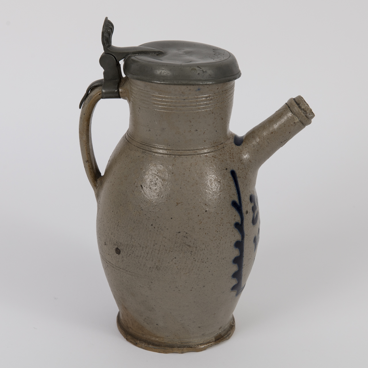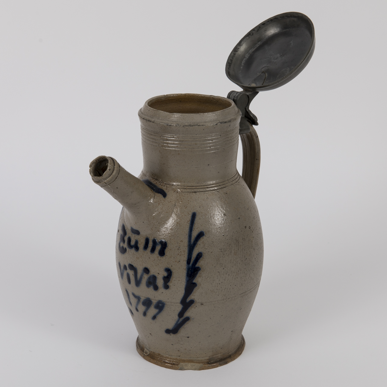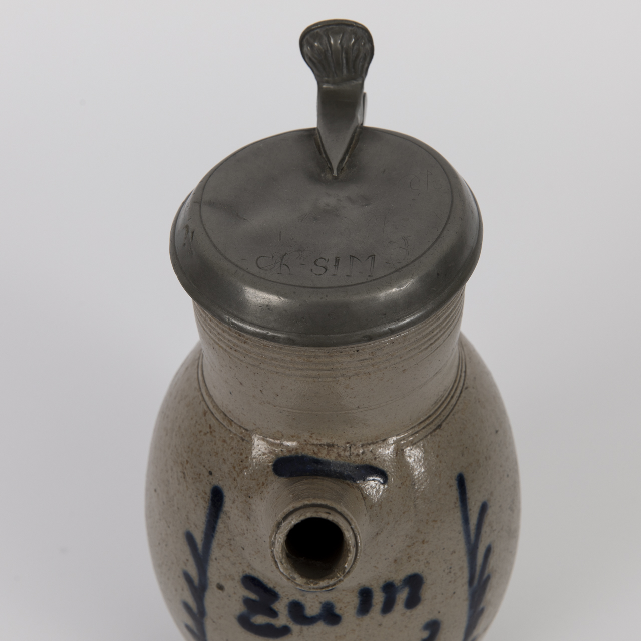 Stoneware, salt-glazed with cobalt-blue decoration; jug with handle, slightly bulbous wall, high-set spout and ear-shaped handle, circumferential incised décor on the neck, hinged pewter lid at the back with thumb rest and engraved inscription “-Ch-SIM”; on the front, around the spout, a cobalt-blue reserve with the maxim “zum Vivat 1799”; spout repaired in several places, chips on the base and deformations in the pewter; height: approx. 26.2 cm; weight: approx. 1045 g.