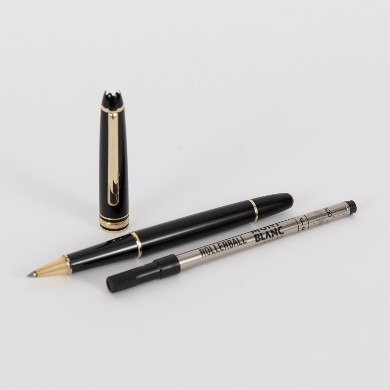 Korpus und Kappe schwarzes Edelharz mit weißem Montblanc Emblem in der Kappenspitze, vergoldete Ringe und Clipringe, Clipring bezeichnet „GERMANY“, Kappenring bezeichnet „MONTBLANC - MEISTERSTÜCK“; dabei eine Ersatzmine; sehr guter Zustand mit leichten Gebrauchsspuren; Länge: ca. 13,5 cm; Gewicht Stift: ca. 23 g; Gesamtgewicht: ca. 28 g.