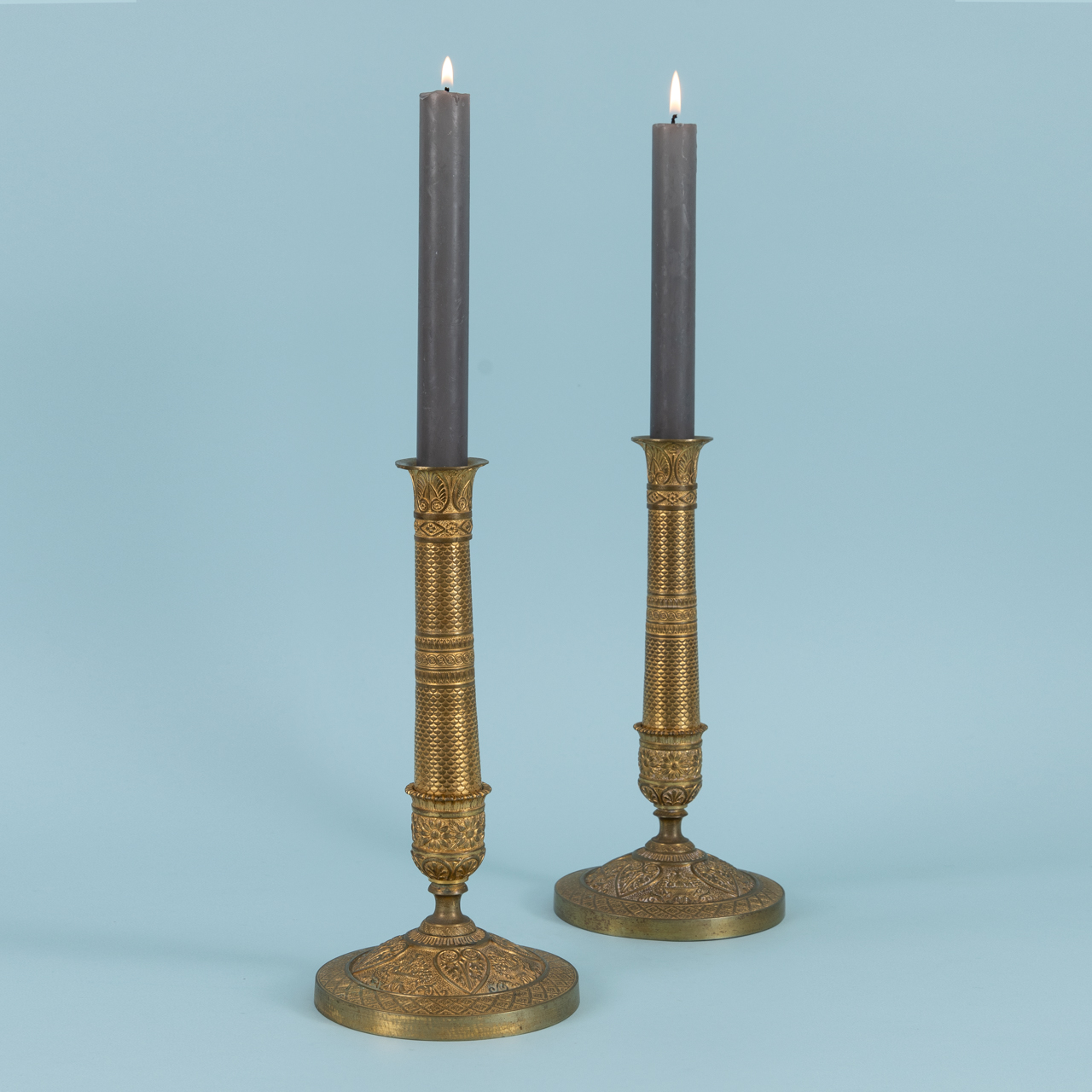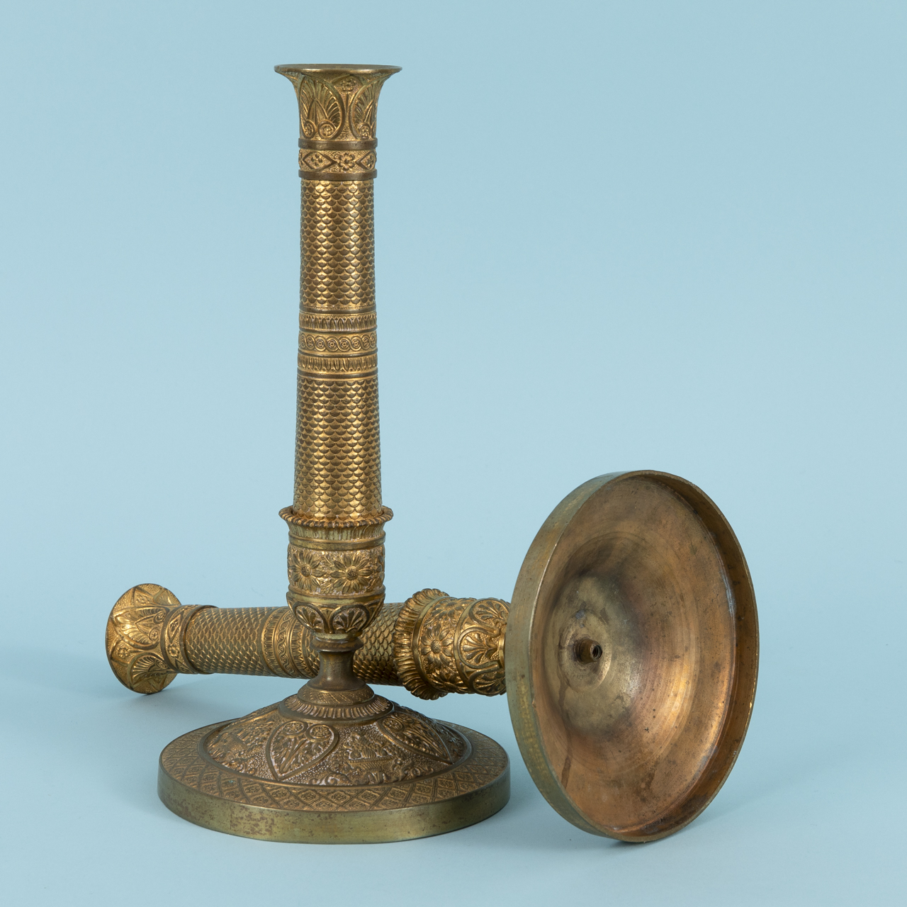 Gilt cast brass-bronze; round, slightly domed base; conical shaft with slightly flared rim; encircling relief ornament and floral decoration; age-related signs of wear; base and shaft soldered together, not screw-mounted; height: approx. 24.8 cm; diameter of the base: 12 cm.