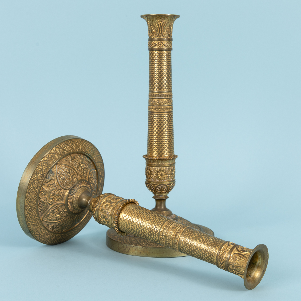 Vergoldete, gegossene Messing-Bronze; runder, leicht gewölbter Standfuß; konischer Schaft mit leicht ausgestelltem Öffnungsrand; umlaufender, reliefierter Ornament- und Floradekor; altersbedingte Abnutzungserscheinungen; Standfuß und Schaft festgelötet, nicht schraubbar; Höhe: ca. 24,8 cm; Durchmesser des Standfußes: 12 cm.