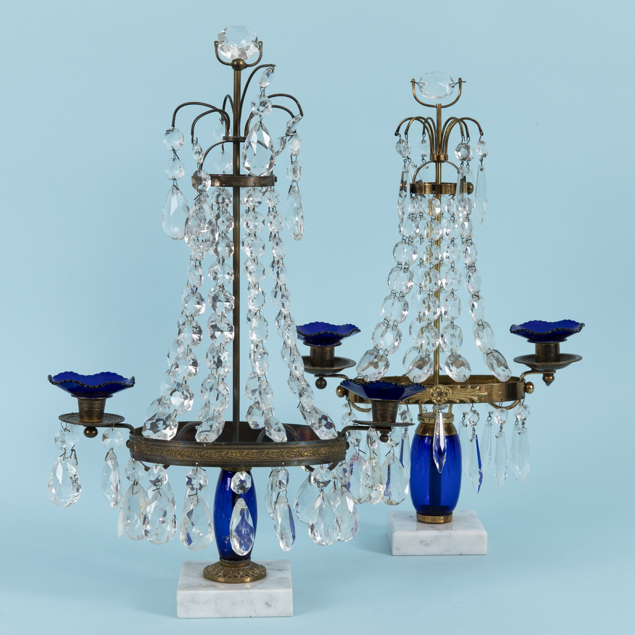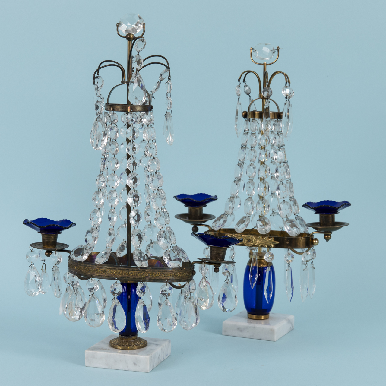 Two different models; square plinths of white marble with grey veining; blue baluster-shaped glass shafts; gilt, ornamentally decorated mounts and candle nozzles; rich crystal drop decoration in round, icicle- and drop-shaped faceted forms; height: approx. 38.5 cm and 41 cm; age-related signs of wear.